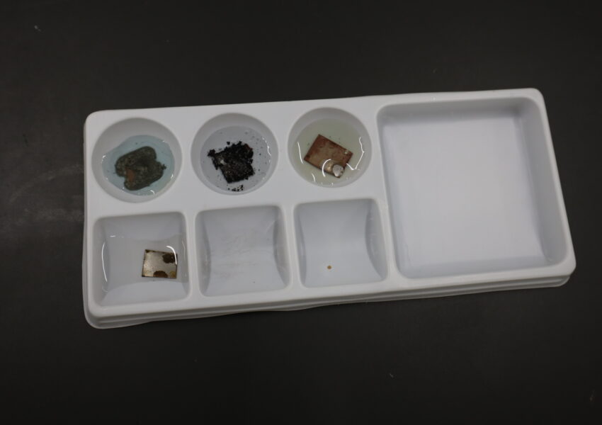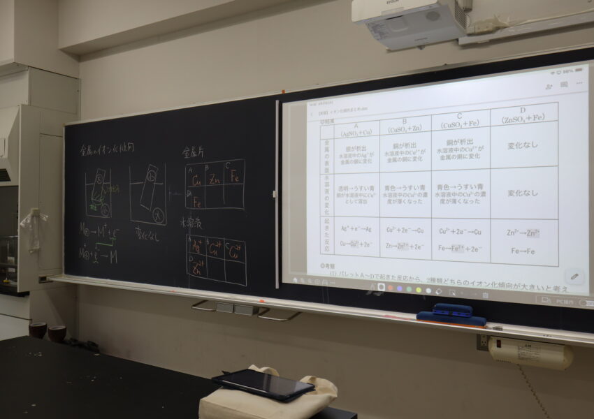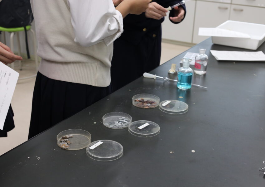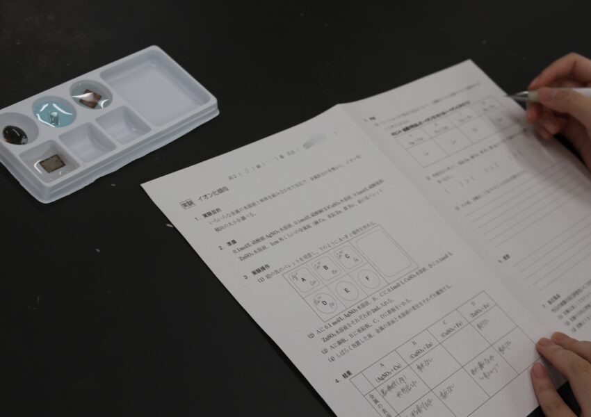 高2の4・5群化学は、受験科目として理科を2科目学習する生徒向けの授業で、今年は5名の生徒が履修しています。今年度最初の実験は「金属のイオン化傾向」を調べる実験を行いました。