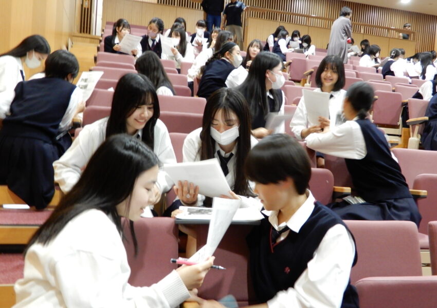 これまでの探究の授業では、高3の先輩方や東京薬科大学の井上先生、麻布大学の菊水先生に「探究とは何か」「どのように探究学習を進めていくのか」というお話を聞き、これから取り組んでいく自分のテーマについてイメージをふくらませてきました。今回、中間テスト前最後の授業では、A4のプレゼンシートに自分が興味を持っていることや、気になっていることなどをまとめ、4人グループに分かれて一人ひとりが発表してみるという試みが行われました。「できるだけ普段しゃべったことのない人とグループになってください」という呼びかけに、最初は緊張した面持ちの人も多かったように思いますが、話を始めると皆熱心に語り、聴き手も相槌を打ちながらじっくり耳を傾けているのが印象的でした。「好きなものを追究して、思い切り語ってみる」という楽しさを感じられた1時間となりました。