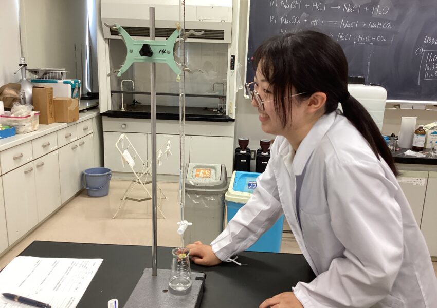 高校3年生の化学選択者に希望制で実験講座を実施しました。テーマは二段滴定・ヘスの法則・有機化合物の分離・硫酸銅(Ⅱ)の電気分解です。どのテーマも入試問題には頻出ですが、実験の細かい内容までは実際に確認しないとイメージしづらい内容を扱いました。