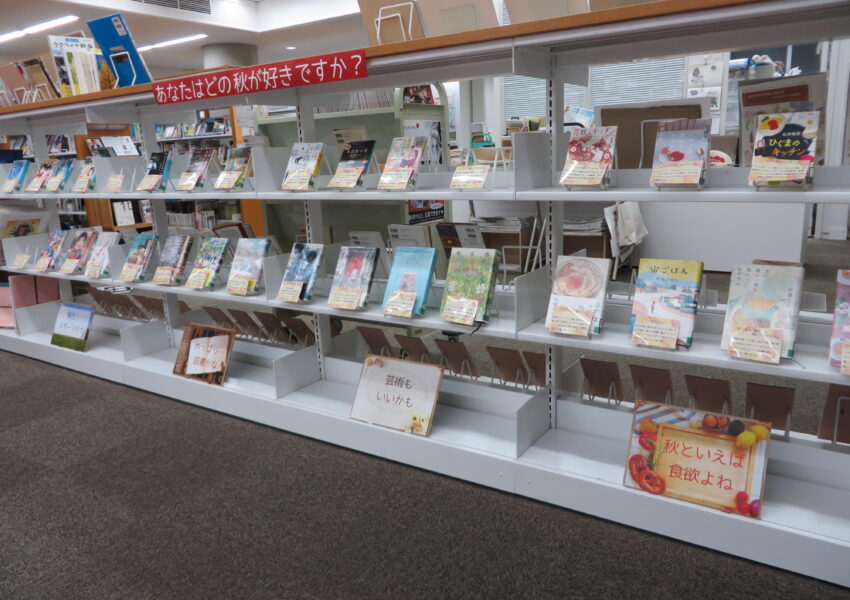 いま図書室では、「あなたはどの秋が好きですか?」というタイトルの展示をしています。いつもとは違う切り口で本を選んでもらえたらいいですね。