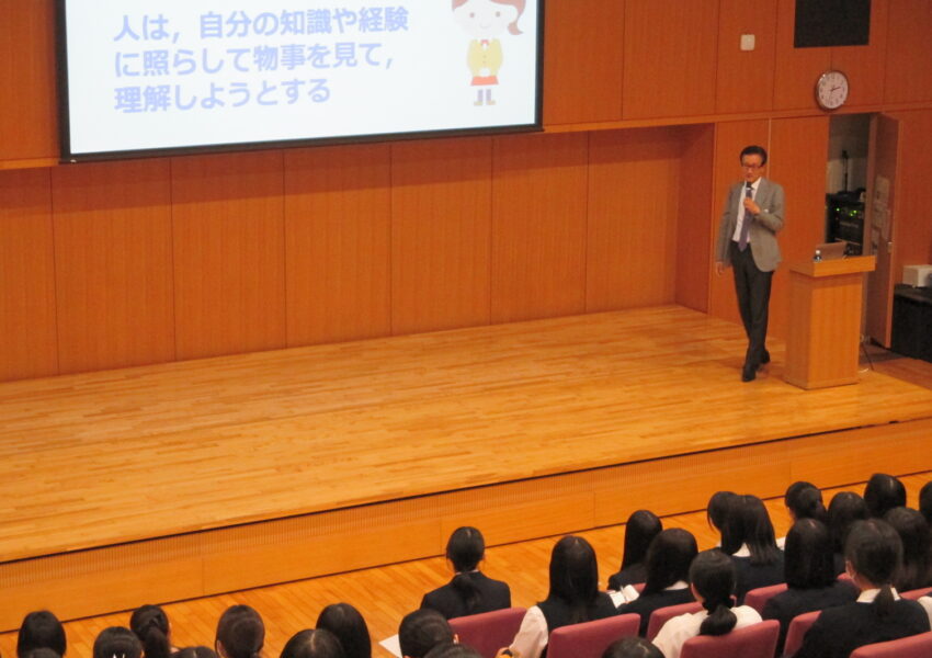 高校2年生では「探究」の時間が始まりました。今年度、最初の授業では、東京薬科大学の井上英史先生をお招きし、「探究」とはどういう取り組みなのかについてお話を伺いました。「問いを立てる」ということから始まり、探究と生き方との関わりに至るまで、とても分かりやすく説明してくださり、生徒は今後の取り組みのイメージがわいてきたようでした。