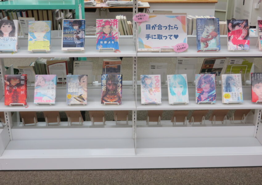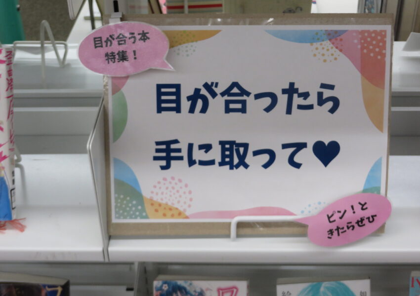 図書室だより2025.09.30.Tue図書室だより 「目が合う本」を展示しています いま、図書室では表紙の顔が印象的な本を集めて「目が合う本」の展示をしています。 表紙のイラストと目が合ったら、借りて読んでみてくださいね!