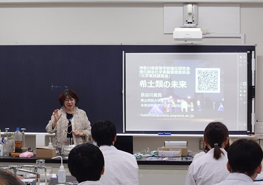 先日、本校化学室が会場となり、神奈川県教科研究会理科部会 化学実験実習委員会主催の「化学実技講習会」が行われました。今年は錯体の光化学がご専門である青山学院大学理工学部化学・生命科学科の長谷川美貴教授を講師にお迎えし、本校理科教員4名を含む約30名の教員が参加しました。