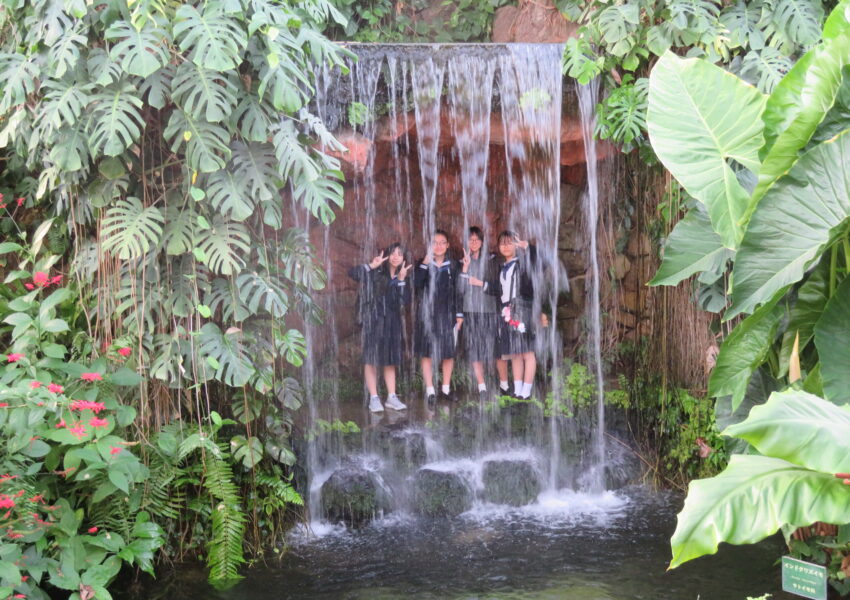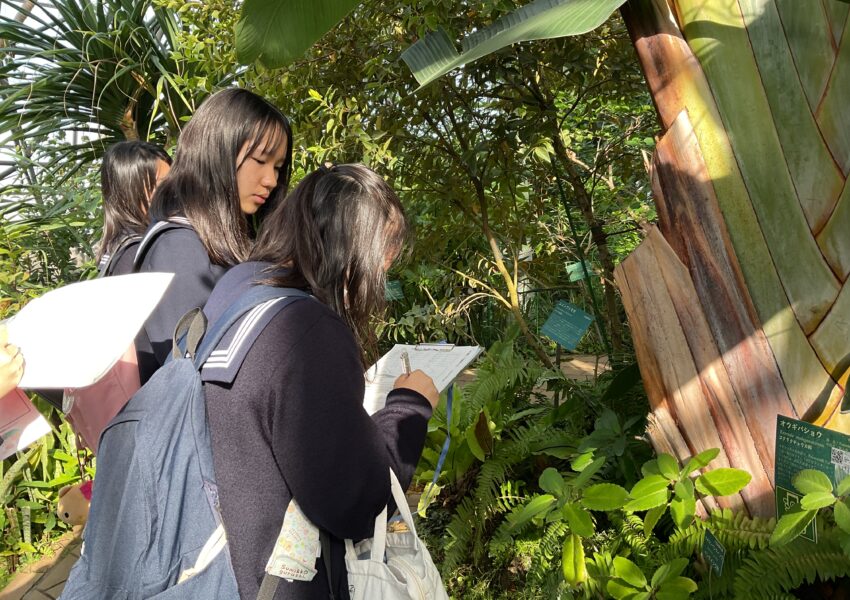 水族園のあとは、夢の島熱帯植物館へ。色とりどりの花や大きな葉を持つ熱帯植物に圧倒され、ジャングルのような空間に驚いていました。事前学習で学んだマングローブや熱帯の気候についての知識を生かしながら、班で協力して課題に取り組む姿が印象的でした。
