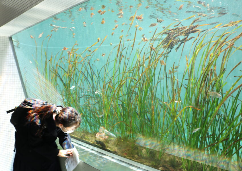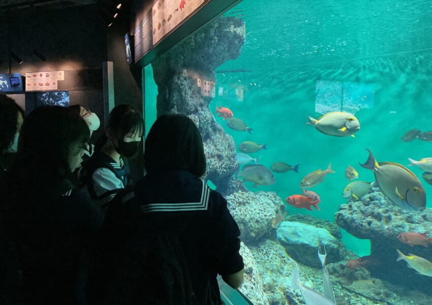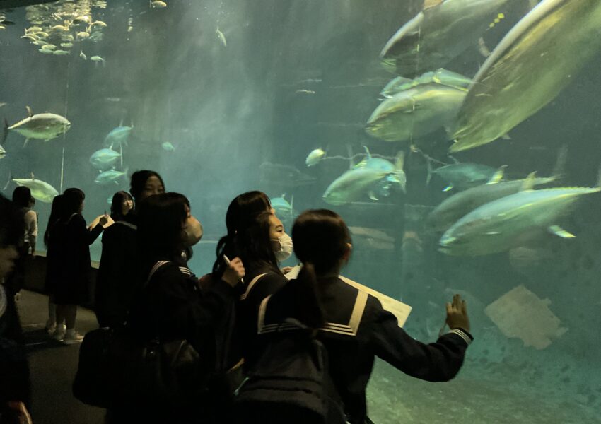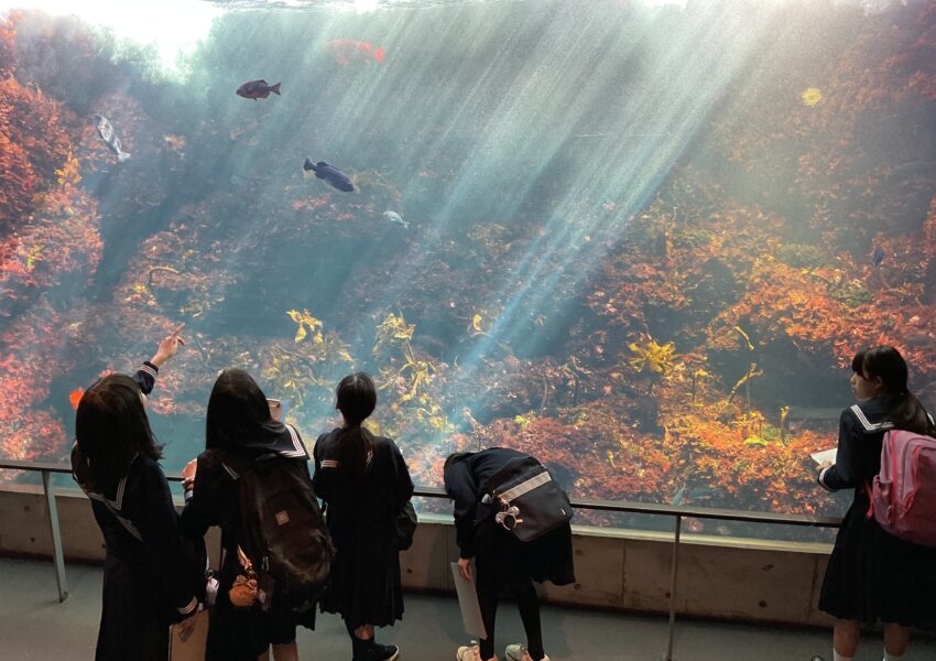 11月7日、中学1年生は東京都の葛西臨海水族園・夢の島熱帯植物館・第五福竜丸展示館へ研修に出かけました。朝早く学校を出発し、秋晴れのもとバスの中では楽しそうな声が聞こえてきました。午前中は葛西臨海水族園を見学し、グループごとにクイズ形式の課題に挑戦しながら、水の生き物の不思議や環境とのつながりを学びました。マグロが勢いよく泳ぐ姿や、南の海のサンゴ礁の展示を見て、理科の授業で学んだ内容を思い出しながら観察する姿も見られました。
