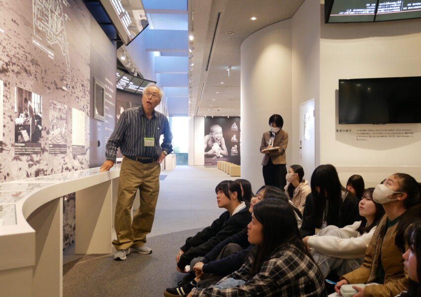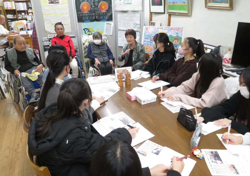 2日目は、「水俣病を学ぶ日」です。3つのグループに分かれて学びを深めました。患者支援を行いながら、当時の貴重な資料を保存・公開している「相思社考証館」と胎児性患者の方がいらっしゃる「きぼう・未来・水俣」、を訪問するグループ、水俣第一小学校5年生との交流を行った後、胎児性患者の坂本しのぶさんに話を伺うグループ、長年家族の水俣病を語れなかった経験を持つ吉永理巳子さん、高校生と共に『水俣食べる通信』に取り組んでいる諸橋賢一さんに出会うグループに分かれて学びました。フィールドパートナーの方の案内で、チッソ工場跡や八幡残渣プール、百間排水口跡など、水俣の町を歩いて往時の繁栄を想像することもできました。夜は、失われた命のバトンをつなぐ取り組みをされている医師・板井八重子先生の話に熱心に耳を傾けました。