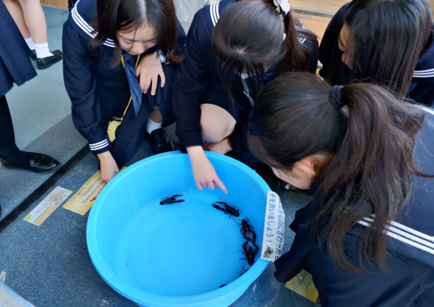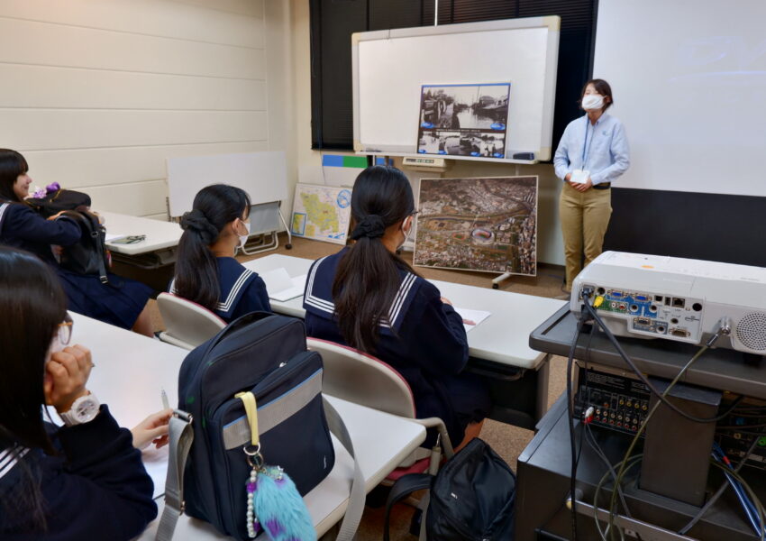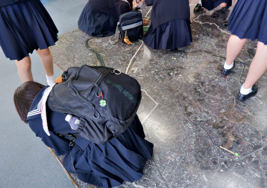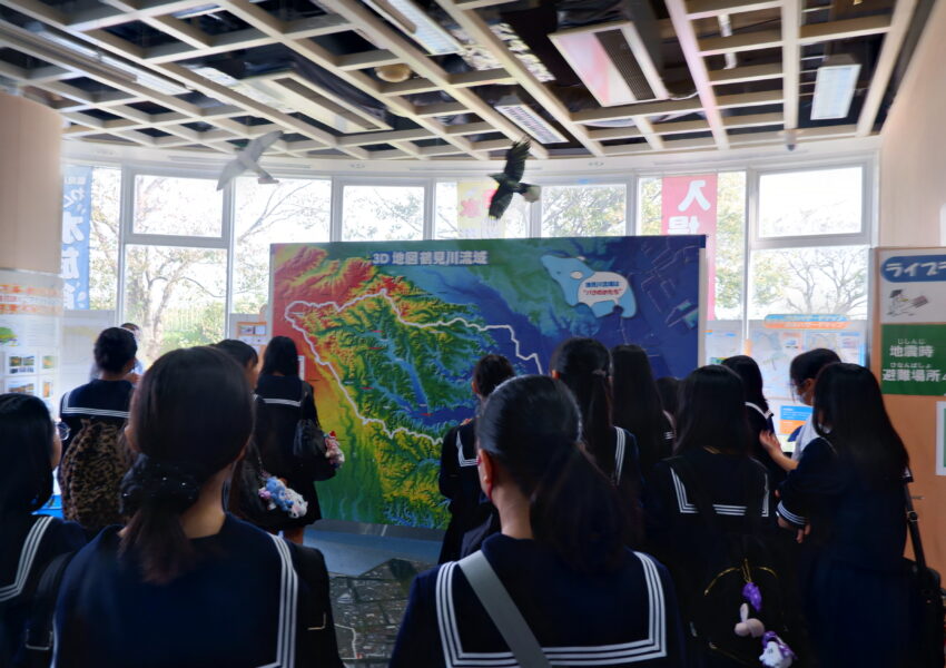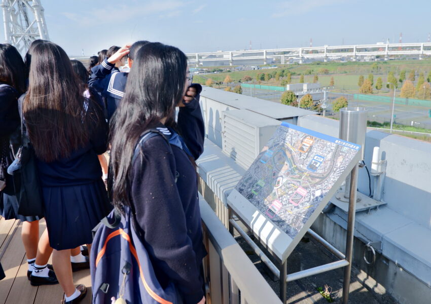 中学2年生は11月7日に環境学習の一環として鶴見川流域センターを訪れました。これまでに小網代の森研修や授業を通して、流域について学んできました。鶴見川の流域エリアを示した大きな地図や映像を観て、自分たちの住んでいる地域の治水の歴史を知ったり、屋上から見えた遊水地の規模の大きさに驚きの声が上がっていました。