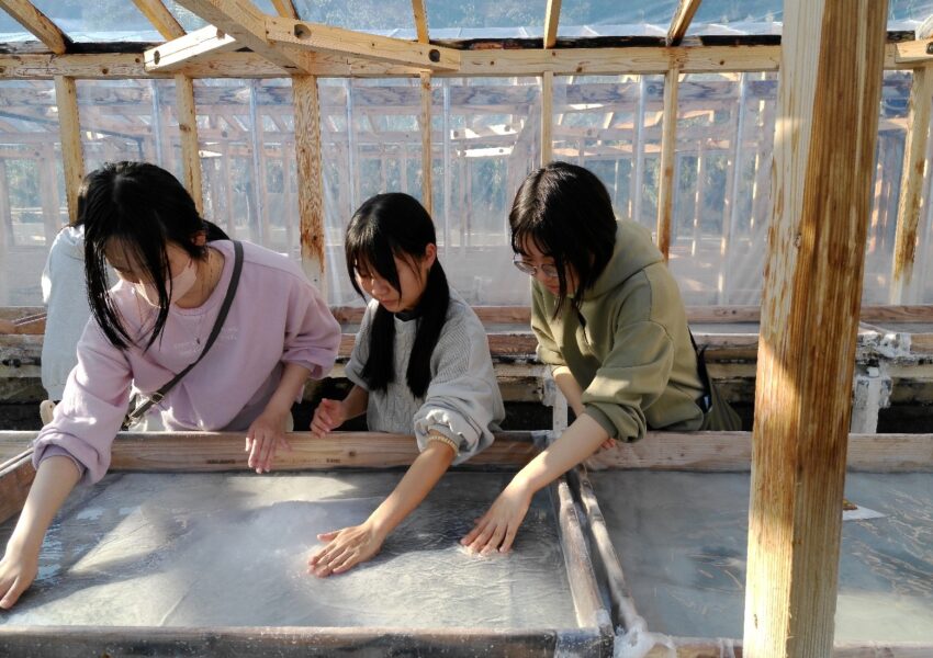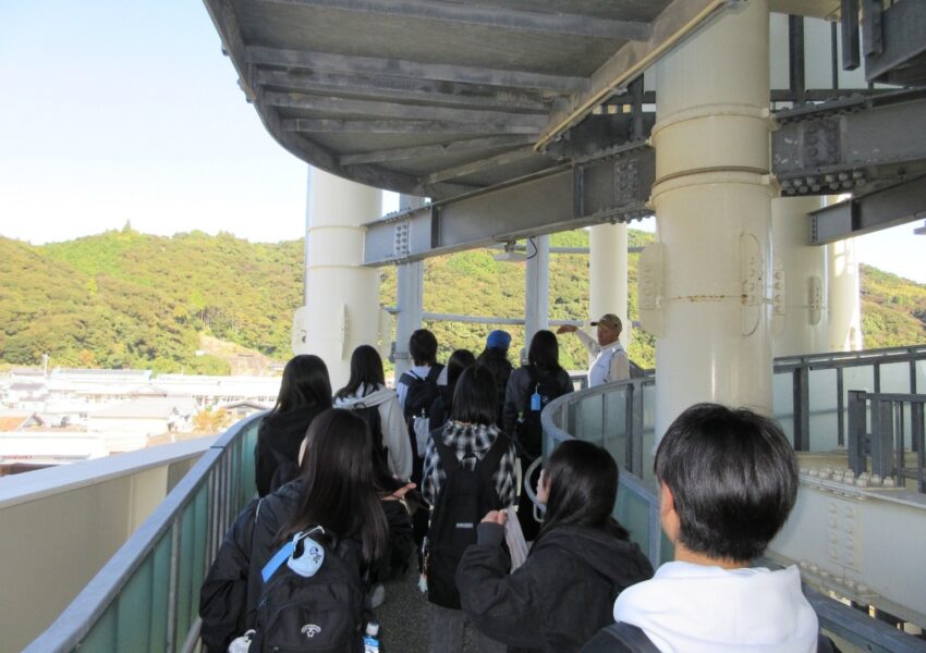 生物と触れ合う以外にも、林業体験やカツオのタタキづくり体験、天日塩づくり体験など、さまざまな体験を行いました。林業体験では、持続可能な森林管理の重要性について学びました。定期的に木の伐採が行われている森林とそうではない森林を比較して違いを確認したり、実際に木を切り倒したりしました。四万十川地域は、美しい自然とは裏腹に、過疎化という深刻な課題に直面しています。地元の方々からは、若い世代が減り、祭りなどの文化や地域コミュニティを維持する難しさを直接聞くことができました。それでも、観光や特産品開発を通じて地域を活性化しようとする努力や、外部からの移住者を受け入れる取り組みには、大きな可能性を感じました。また四万十川地域は、自然の恵みだけではなく脅威にもさらされています。現地は南海トラフ地震が発生した際に、巨大津波の到達が想定されている地域です。現地での防災について学ぶため津波避難タワーを見学し、実際に上りながらお話を聞きました。過去の津波の高さを考慮したうえでタワーの何階以上まで避難する必要があるかなど、常に災害を想定し訓練を繰り返しながら備えをする意識の違いを感じていました。