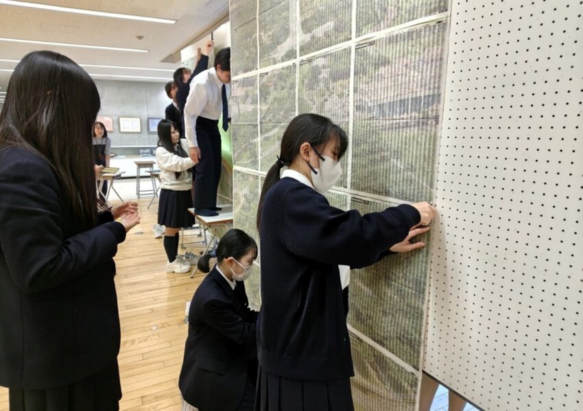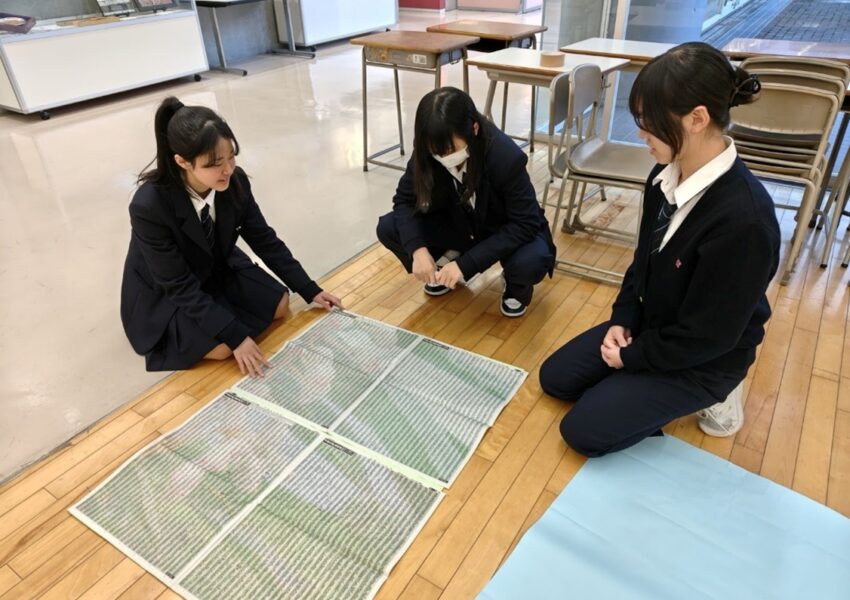 生徒たちは、戦没者の氏名が記された一枚一枚の記事を丁寧に並べ、協力しながら手際よく展示を形づくっていきました。紙面を並べると、全体として大きなデザインが立ち上がる構成となっており、通りかかった生徒たちは足を止め、びっしりと刻まれた氏名に見入る姿が見られました。多くの命の記録が視覚的に立ち現れる展示は、沖縄戦を学ぶ本校の平和学習に新たな気づきをもたらしています。