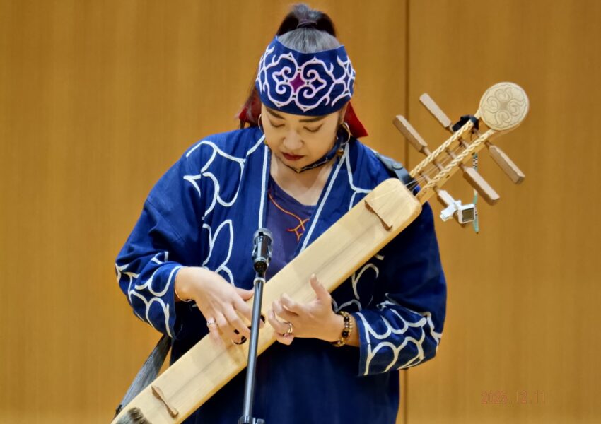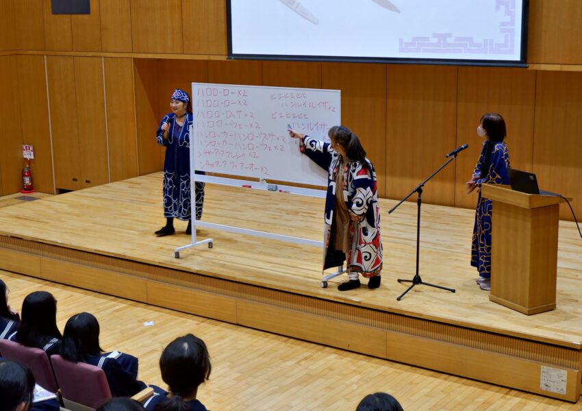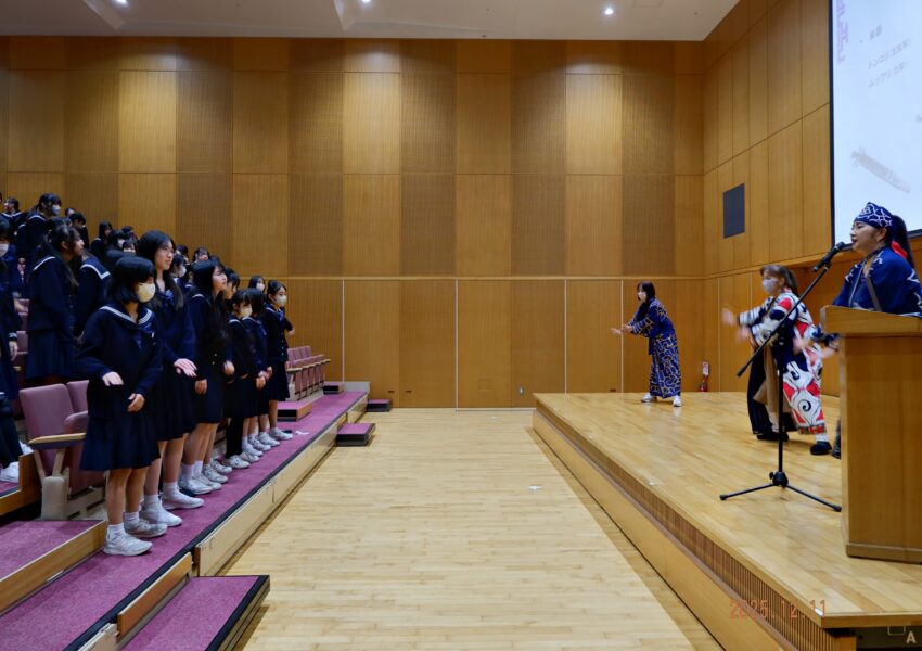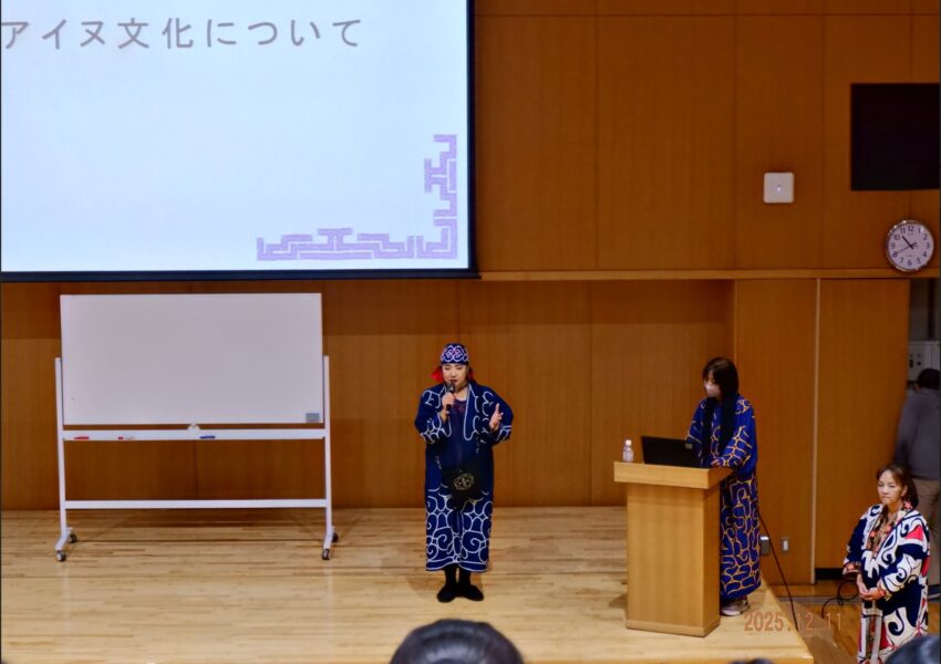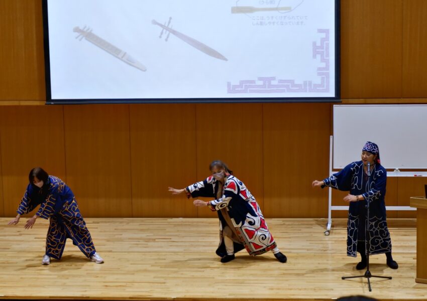 2学期の社会の授業では、民族共生象徴空間ウポポイからアイヌ文化関連書籍の貸出をしていただき、アイヌに関する調べ学習もしてきました。当日は、宇佐照代さんを中心に3名の講師の方をお招きして、アイヌの歴史や文化のことを解説していただいた上で、キツネを主人公にしたアニメの視聴や、アイヌの楽器ムックリやトンコリの演奏を聞かせていただき、その音色に合わせてアイヌの歌や踊りを学びました。最後には学年全体で演奏に合わせながら歌って踊り、生徒たちも肌でアイヌの文化を感じることができました。