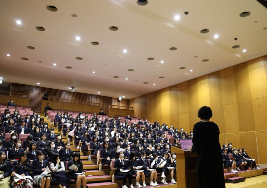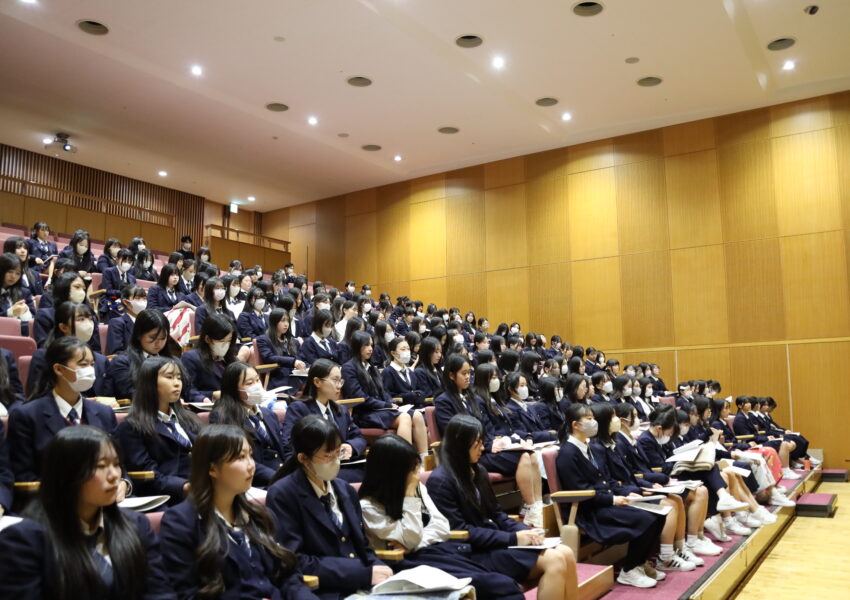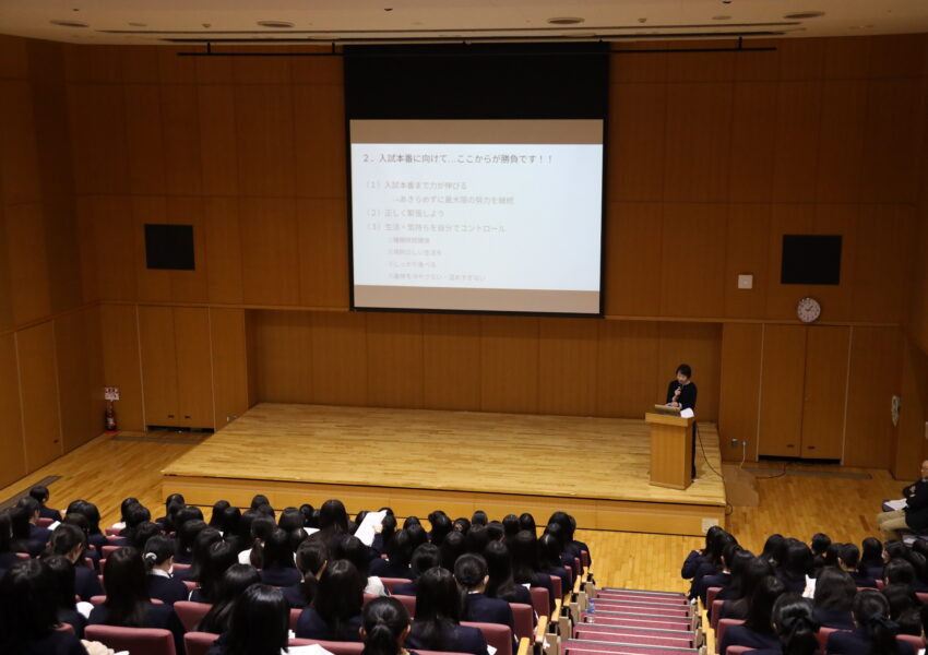 高校3年生は、全員で受ける授業や定期テストも全て終わり、いよいよこれから一人ひとりの進路開拓に向けて本番を迎えていきます。担任や進路担当との面談も佳境を迎えている中ですが、今日は全員がシュガーホールに集まって、これまでの生活を振り返りながら、受験本番に向けての心構えについてお話がありました。