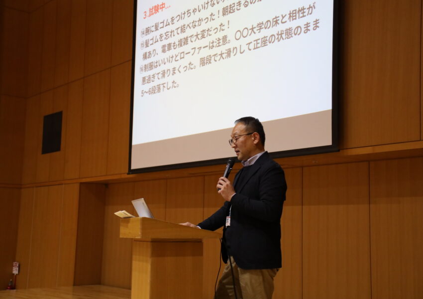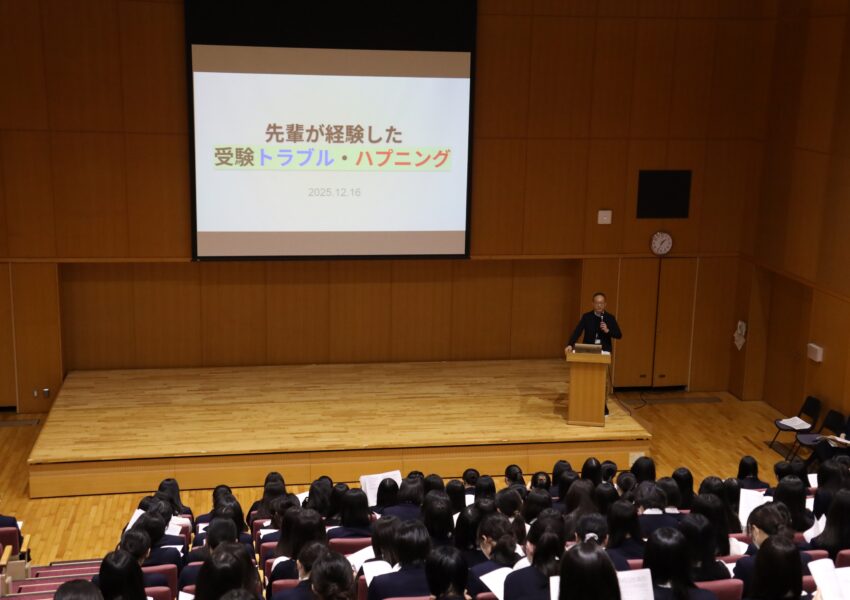 学年主任からは、2学期の授業や行事の様子を振り返りながら、冬休みに向けての確認事項や入試に向けての激励の言葉がありました。2学期の振り返りの中では、体育の授業で楽しそうに運動している姿や、理科の実験で真剣に取り組んでいる姿も印象的でした。また、進路担当からは、共通テストについての注意事項をはじめ、これまでの先輩方のトラブル・ハプニング集についてお話があり、これから具体的にどのようなことに気を付けて過ごせばよいのか、イメージが湧いたかと思います。
