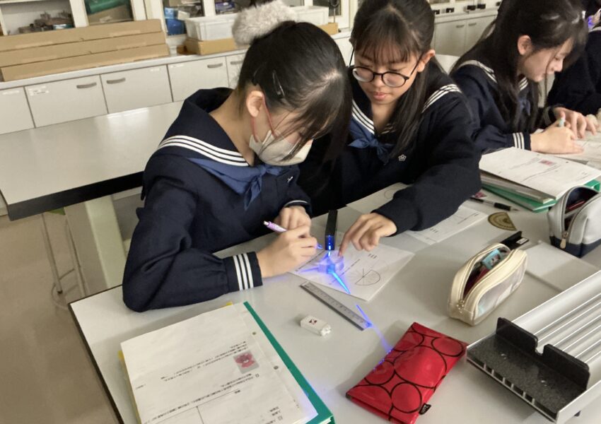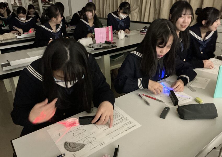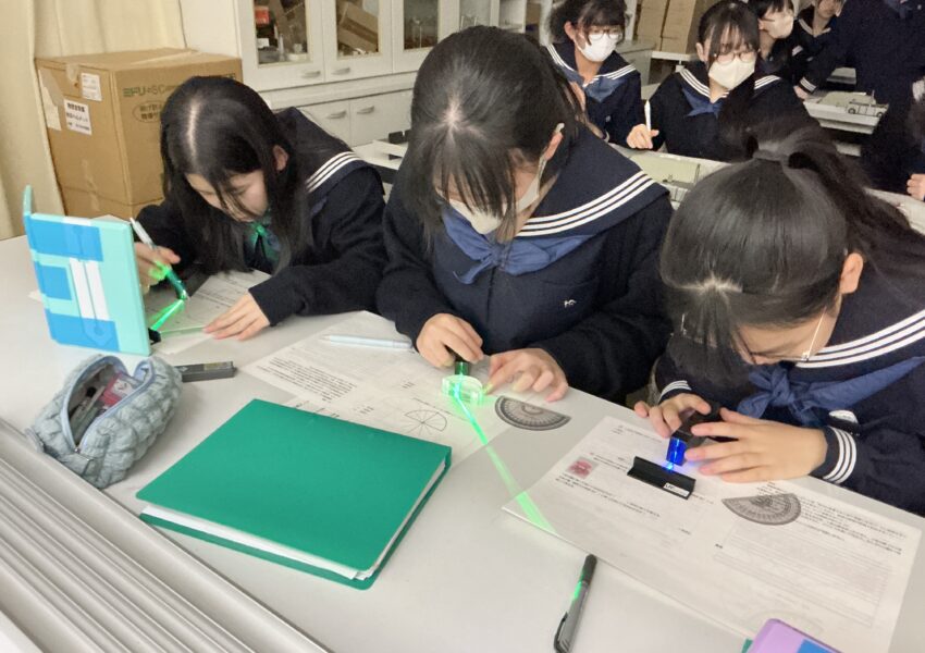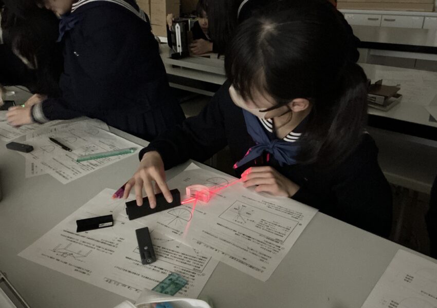 座学だけでは「そういうもの」として受け止めていた内容も、実際に光の動きを目で追うことで、「なぜそうなるのか」を考えるきっかけとなりました。反射の実験と同様に、体験を通して学ぶことで、光の性質への理解が一段と深まった様子でした。今回の実験も、生徒たちにとって、光を身近な現象として捉える貴重な学習の機会となりました。