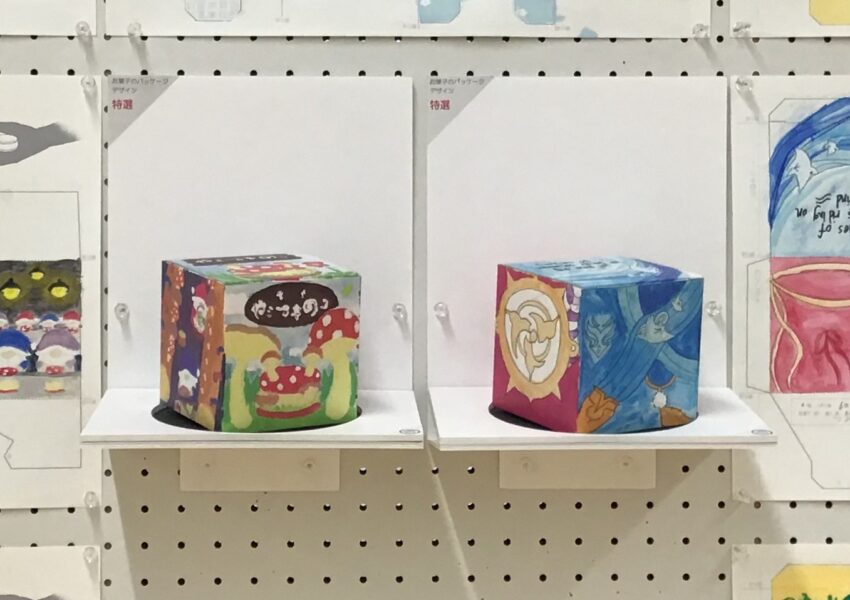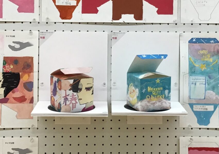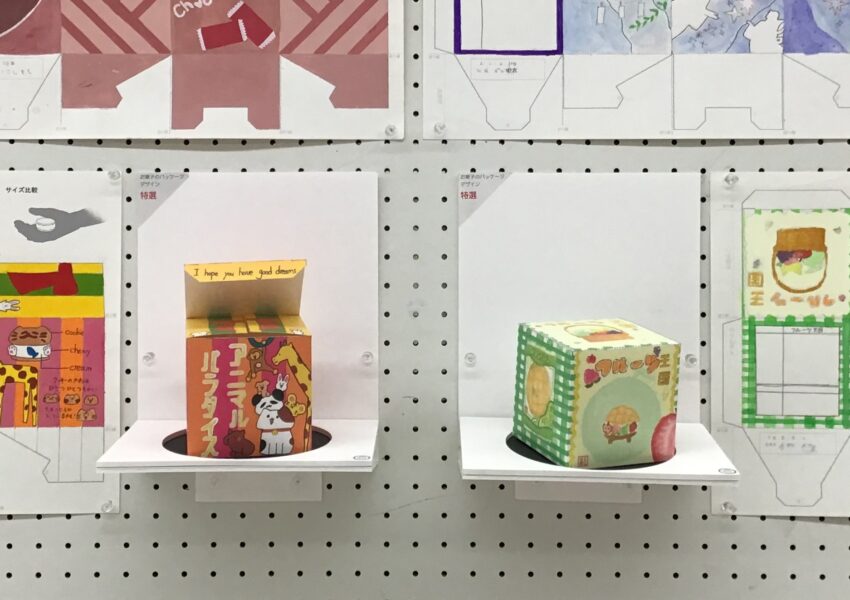 中1は動物がテーマ。一枚の板を彫って版を作り、水彩絵具を使って黒い紙に刷る一版多色木版画で表現しました。直接筆で描くのとは異なる、刷り取ることで得られる独特の味わいが魅力的です。中2は素材や味を想像しながらオリジナルのお菓子を考え、それにふさわしいパッケージをデザインしました。ネーミングやキャッチコピーにもアイデアを盛り込んでユニークな作品になっています。