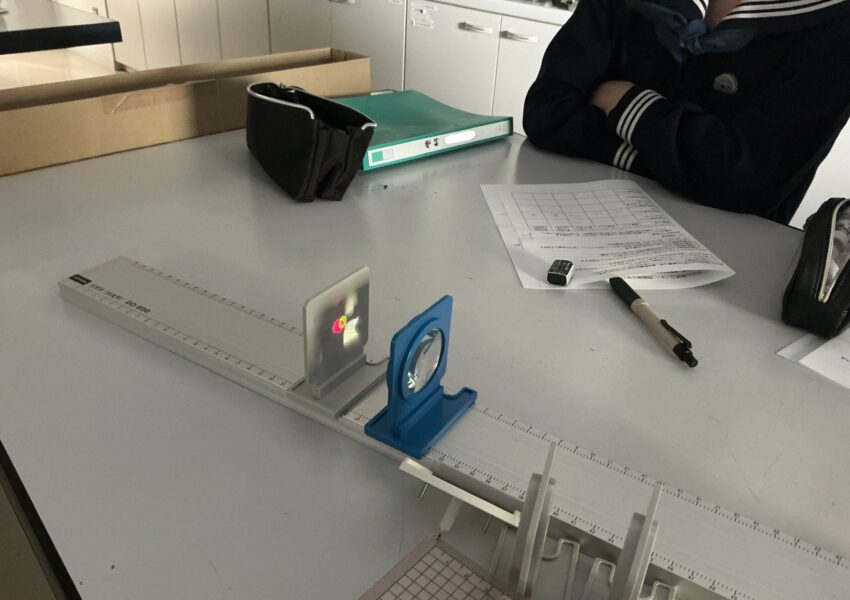 中学1年生の理科では、物理分野として「光」について学習しています。今回は、凸レンズを用いた実験を行い、像のでき方や距離の関係について理解を深めました。