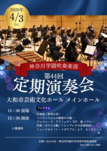 神奈川学園吹奏楽部では、今年度も下記のとおり定期演奏会を開催する運びとなりました。部員一同協力し合い、お客様に少しでも満足していただけるステージを目指して練習を重ねております。