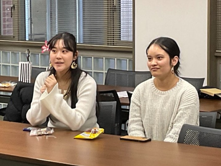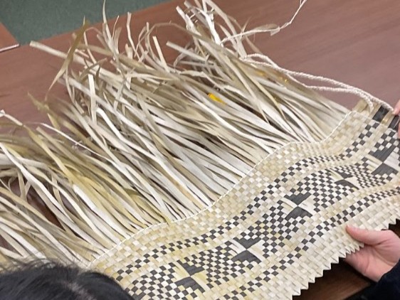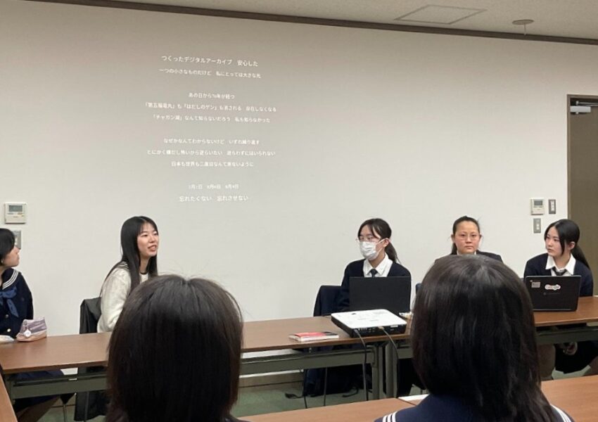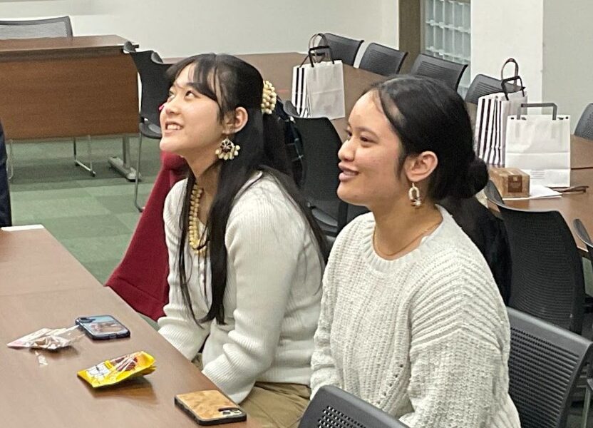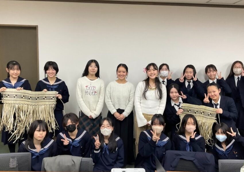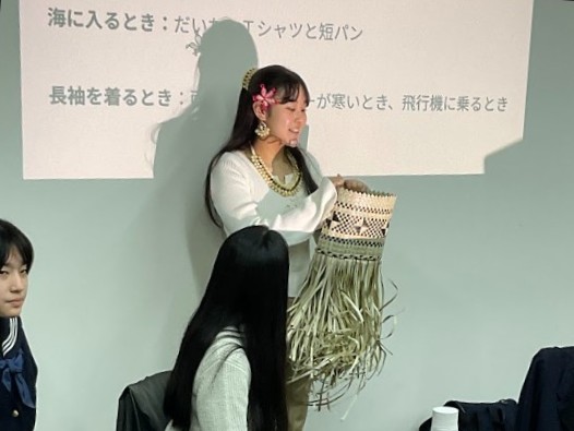 コープの二人からは、演劇や絵画での表現活動やデジタルアーカイブの取り組みを紹介してもらいました。戦前の日本の南洋支配下に移った日本人にも自分のルーツがあることや、戦後のマーシャル諸島との関わりについて、聞き取りした内容をデジタルアーカイブに収めた経緯、そしていま日本で学び始めた理由を教えてもらいました。また、マーシャル諸島の伝統衣装の作り方や、マーシャル語などについても興味を持った本校生徒から質問が相次ぎました。