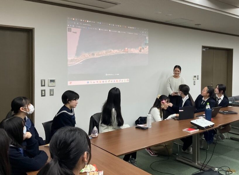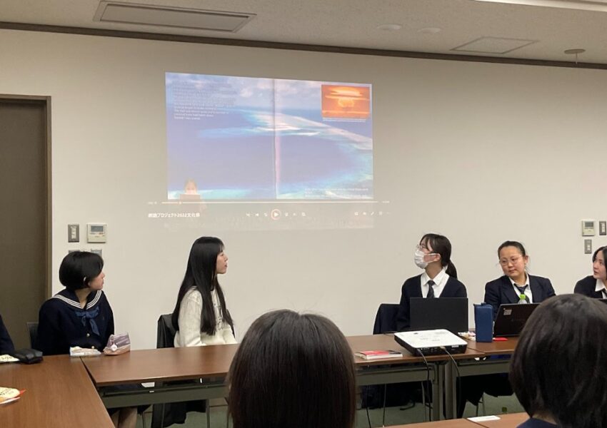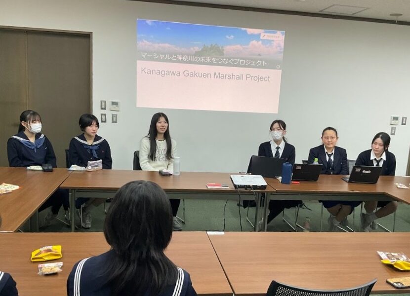 神奈川学園のプロジェクト活動の一つ、マーシャルプロジェクトは「マーシャル諸島と神奈川の未来をつないで」というテーマで活動を続けています。2019年より交流を重ねているマーシャル諸島共和国コープスクールの卒業生で、現在日本の大学で学んでいるお二人をお招きし、本校のプロジェクトメンバーと対面交流を行いました。中学生の案内で学内や学校生活を紹介し、二人は、日本の学校の設備の大きさに驚いた様子でした。また、高校生も加わって、ビキニ事件の継承を中心に、お互いにこれまで取り組んできたことを紹介しました。