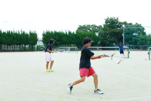 雨に強い人工芝のテニスコートで、メンバーで話し合って練習メニューを工夫しながら県大会出場をめざして毎日がんばっています!